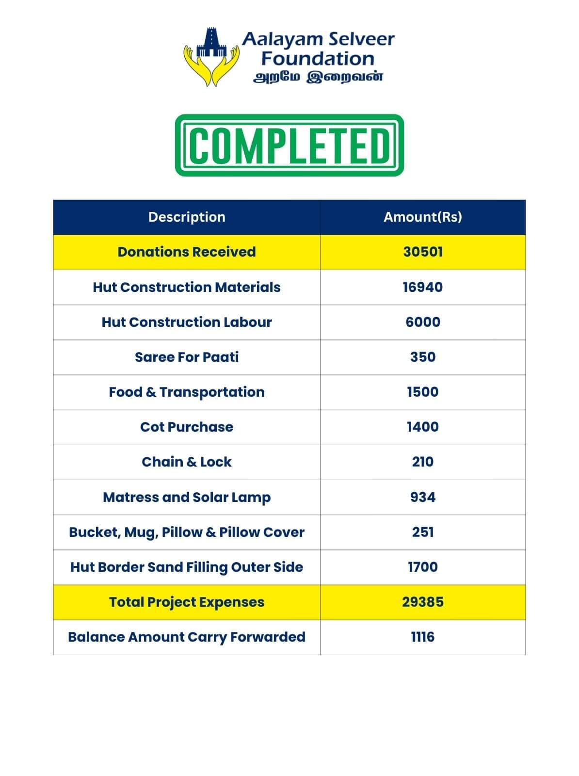 தாராளமாக நன்கொடை அளித்து, நாகம்மா பாட்டியின் வாழ்வில் மீண்டும் ஒளியேற்றிய நன்கொடையாளர்களுக்கு நன்றி. இந்த உதவியை மிக விரைவாகச் செய்து முடித்த எங்கள் அர்ப்பணிப்புள்ள தன்னார்வலர்களான திரு. சிவ ரீகன் ராஜ் மற்றும் திரு. பிச்சைமுத்து ஆகியோருக்கும் எங்கள் மனமார்ந்த நன்றிகள். உங்கள் தொடர் ஆதரவுடன், ஆலயம் செல்வீர் அறக்கட்டளையான நாங்கள், இதுபோல இன்னும் பல அழகான நம்பிக்கைக் கதைகளை உருவாக்குவோம் என்பதை உறுதியாக அறிவோம்.
